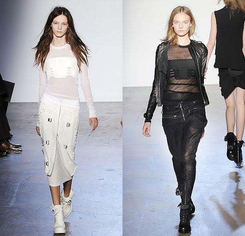 First up, Phi. A lot of what was shown feels more fall to me, maybe because it's what I want to wear right this very moment. Phi convinced me that a "military" influence can look cool again, especially when it's not playing up the obvious Tank Girl look, but more of an urban chic (I hate both of those words btw). The boots look KILLER from what I can see and those sheer long tops with built-in bandeau section are a must.